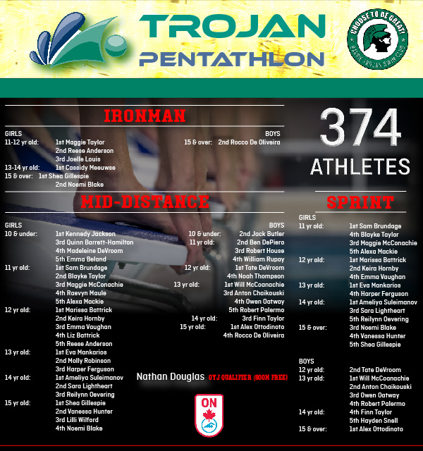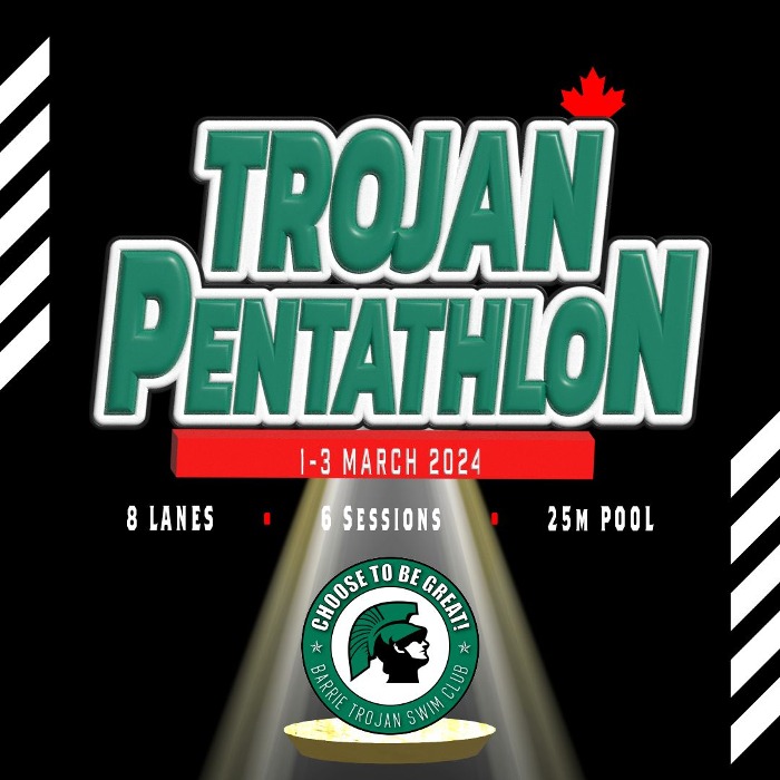 The Barrie Trojans were host to the Pentathlon swim meet Mar. 1 - 3, 2024. This is a fun and unique event where swimmers compete in groups of five events (sprint, mid-distance, ironman) where total times for each athlete are calculated with the swimmer achieving the lowest cumulative time is declared the winner for each age category. Amazingly, after swimming more than 43 minutes total, one of the ironman age groups was decided by 5 seconds. A total of 374 swimmers representing Peterborough, Orangeville, Orillia, Oakville and the Barrie Trojan swim clubs participated. Congratulations to all of the BTSC swimmers for which Pentathlon was their first ever competitive meet!