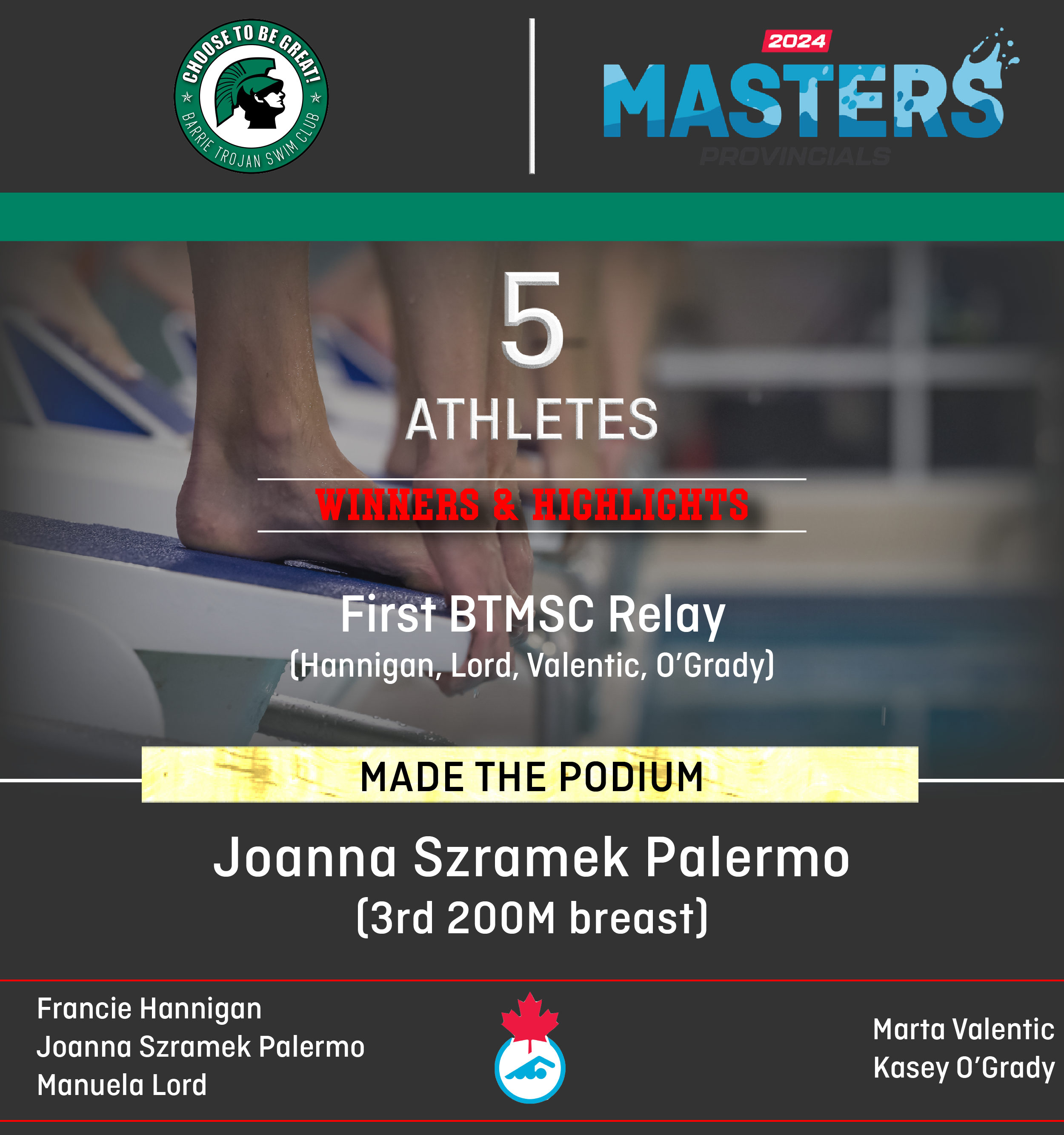 It was fantastic to see a team of Barrie Trojan Masters swimmers participate in the 2024 Masters Ontario Provincials at the Etobicoke Olympium on Apr 19-21. The meet welcomed all levels of competitors and included former Olympians, National level athletes, World, National and Provincial record holders. Swimmers competed in various age categories with the oldest competing at an absolutely amazing 100 years old. BTMSC was one of 43 clubs participating at the meet. Amongst all of the Masters swimming talent, and under the direction of Coach Maks, were a few of our own swimmers : Francie Hannigan, Manuela Lord, Kasey O’Grady, Joanna Szramek Palermo and Marta Valentic.