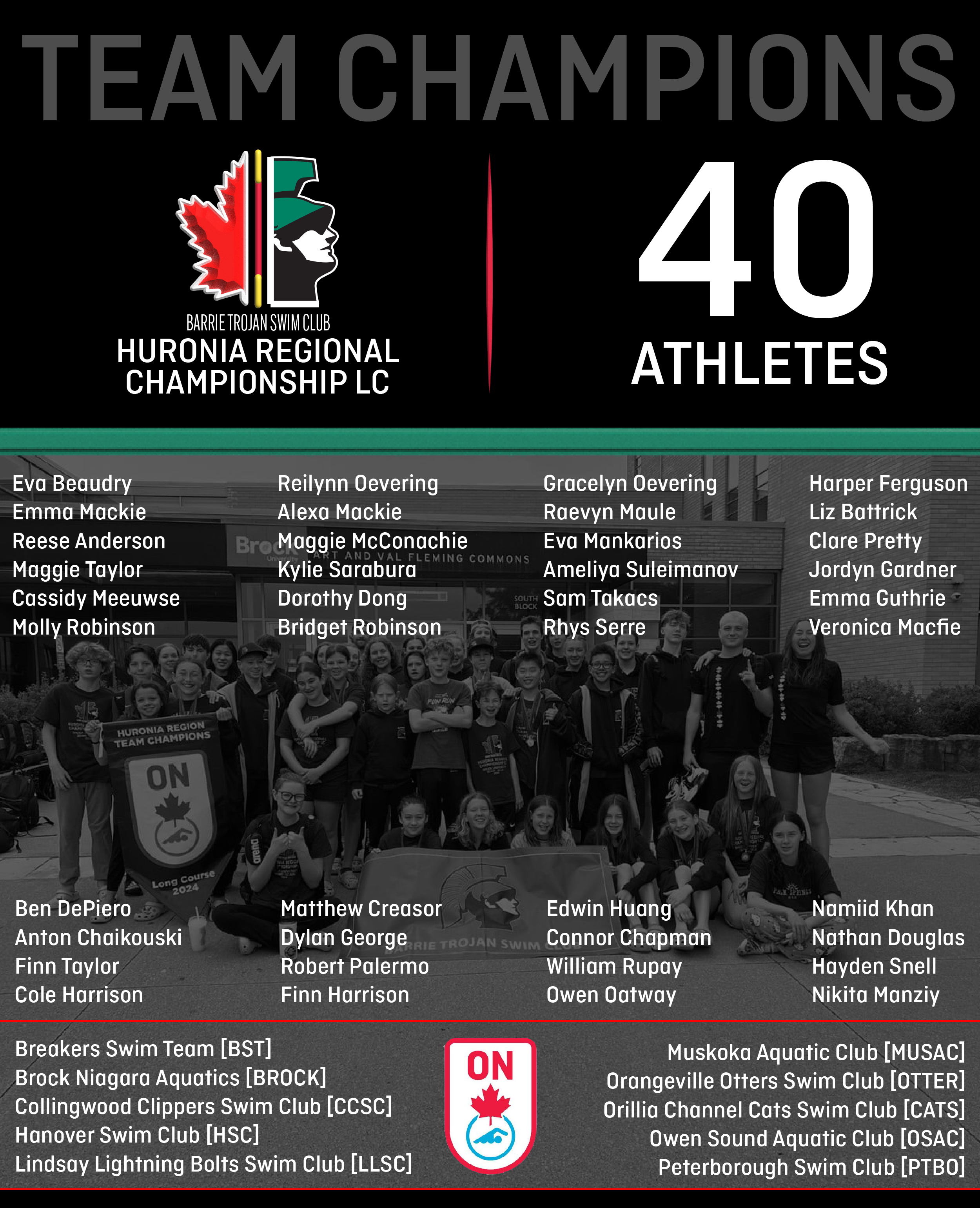 A BTSC team of 40 swimmers competed at Brock University from May 31 - June 2, 2024 at the Huronia Regional Long Course Championship. This team raced hard all weekend and were crowned meet champions, earning the 2024 championship banner. All of the 40 swimmers contributed points to our overall team score.