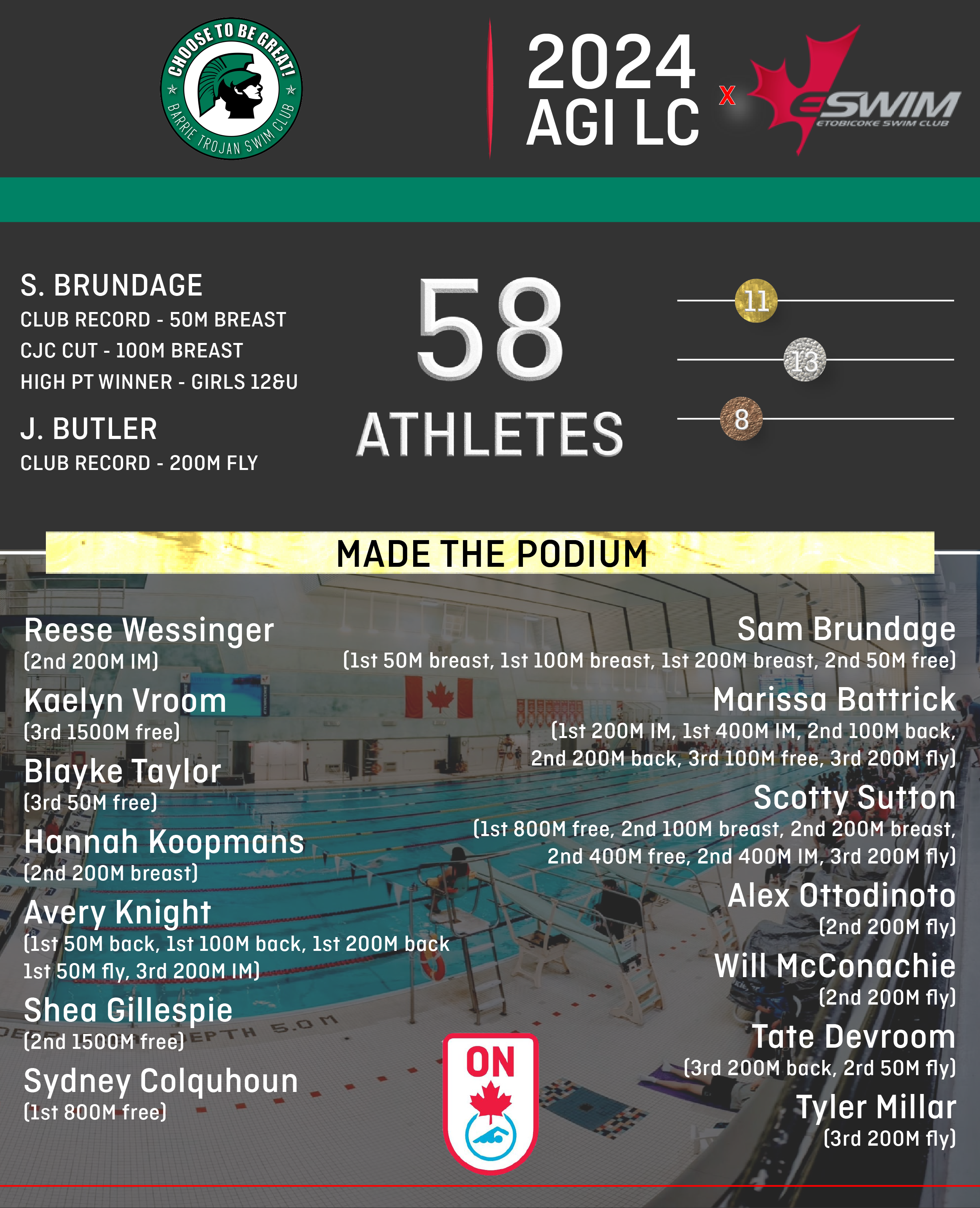 Fifty-eight BTSC swimmers competed at the Etobicoke Olympium May 30 - June 2 at the Age Group International swim meet. There were 24 clubs represented at this meet including some out of province swimmers. This meet was highly subscribed leading to an abundance of competition.