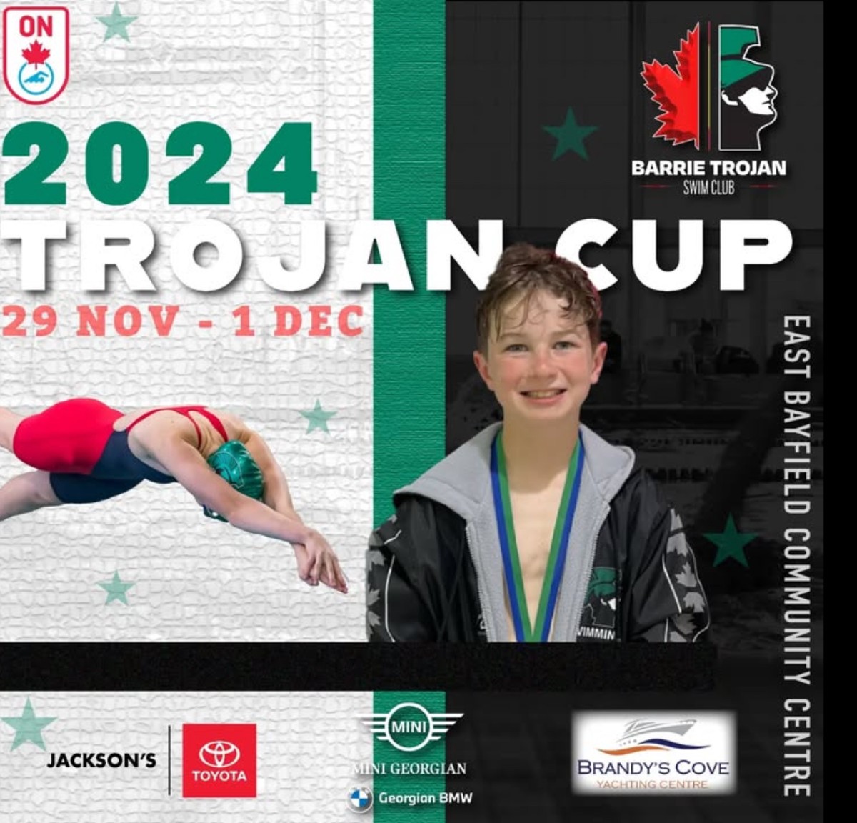 The Barrie Trojans hosted Trojan Cup Nov. 29 - Dec. 1, 2024 and welcomed the Orillia Channel Cats, Wilmot Aquatic Aces, Orangeville Otters, and Markham Aquatic Club to the East Bayfield Community Centre pool.