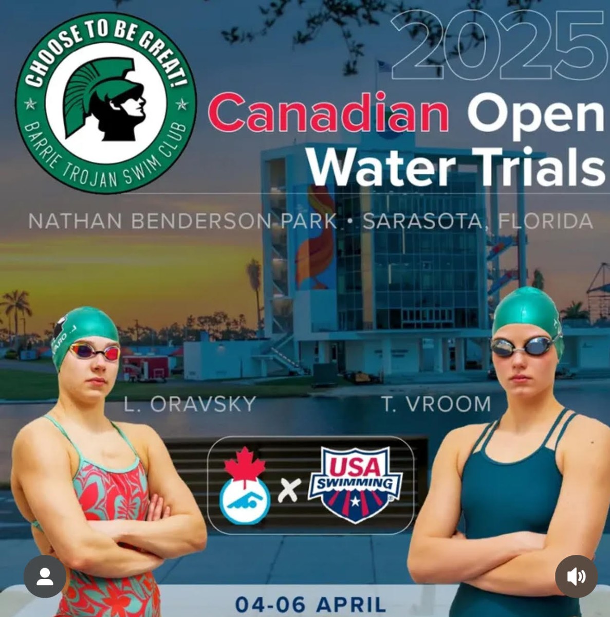 In partnership with USA Swimming, the Canadian Open Water Trials were held in sunny Sarasota, Florida from April 4 to 6, 2025. BTSC swimmers Taira Vroom and Laila Oravsky along with Coach Endi took part in this high-level competition. These trials along with 1500M race times will be used by Swim Canada to select the World Championship team.